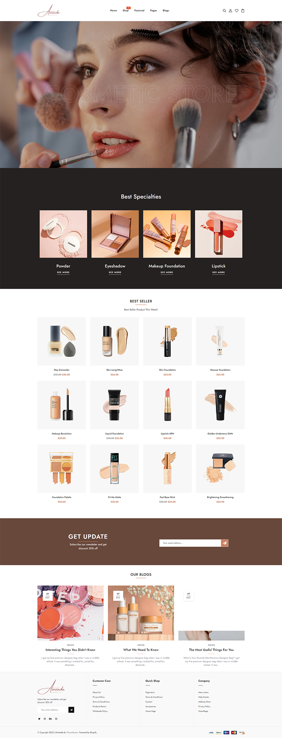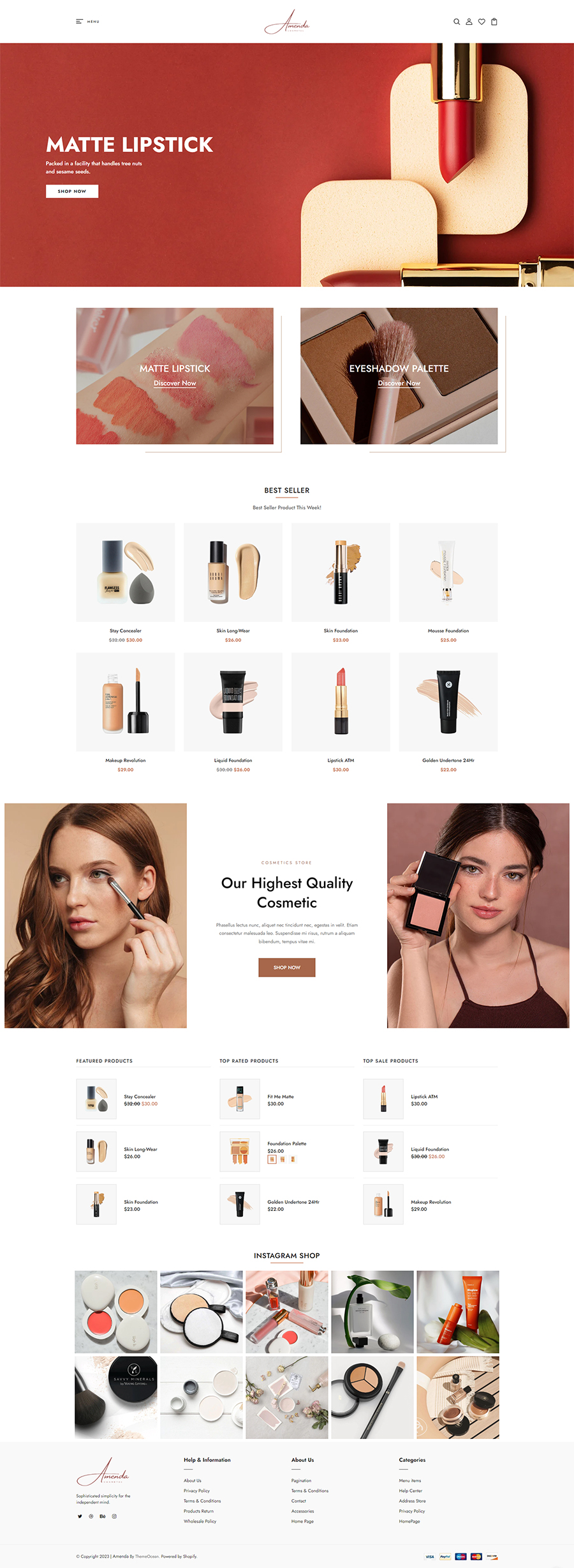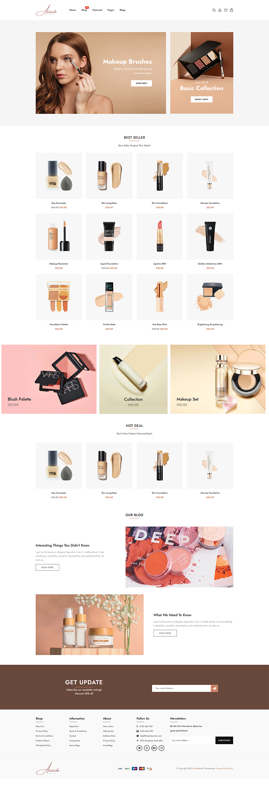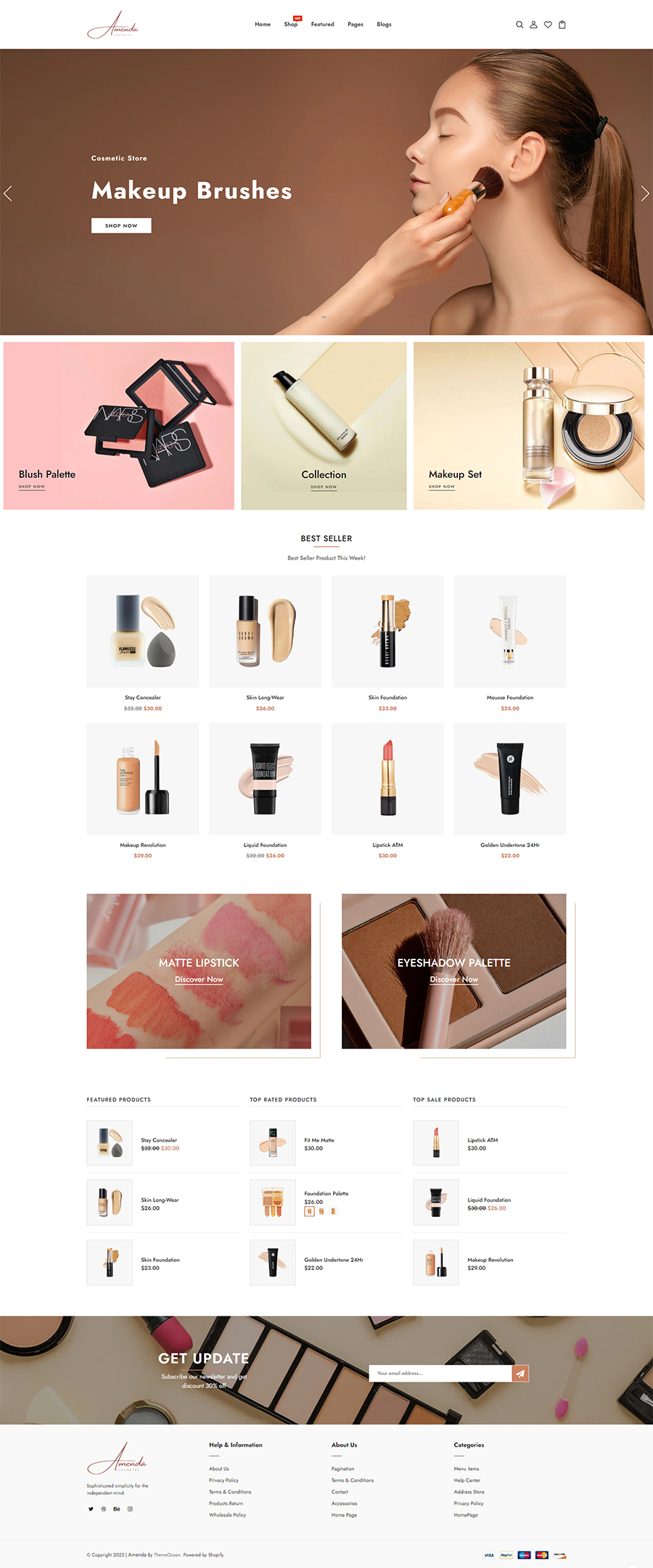 The theme includes all shop pages: Product listing, product detail, add to cart, checkout, quick view ... with customized layout and style to make it look incredible. The product filtering system is powered with the integration of modules: Categories list, Filter based on product attribute, New products, Related products... to help user find out their best fit items at a glance. The Shopify theme is easy to customize with the Theme Customizer tool that let you change settings for most of the pages, sections in the site based on predefined parameters.